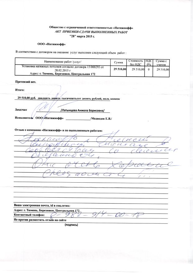 Я Никитин С.К., очень благодарен, вашей фирмой ООО "Натяжнофф" в особенности вашей бригаде, в профессионализме выполненной работы, очень чётко, очень аккуратно, и быстро. Хочу поблагодарить директора Е.В.Медведева, и очень попросить, чтобы бригаду вознагродили в денежном эквиваленте.
